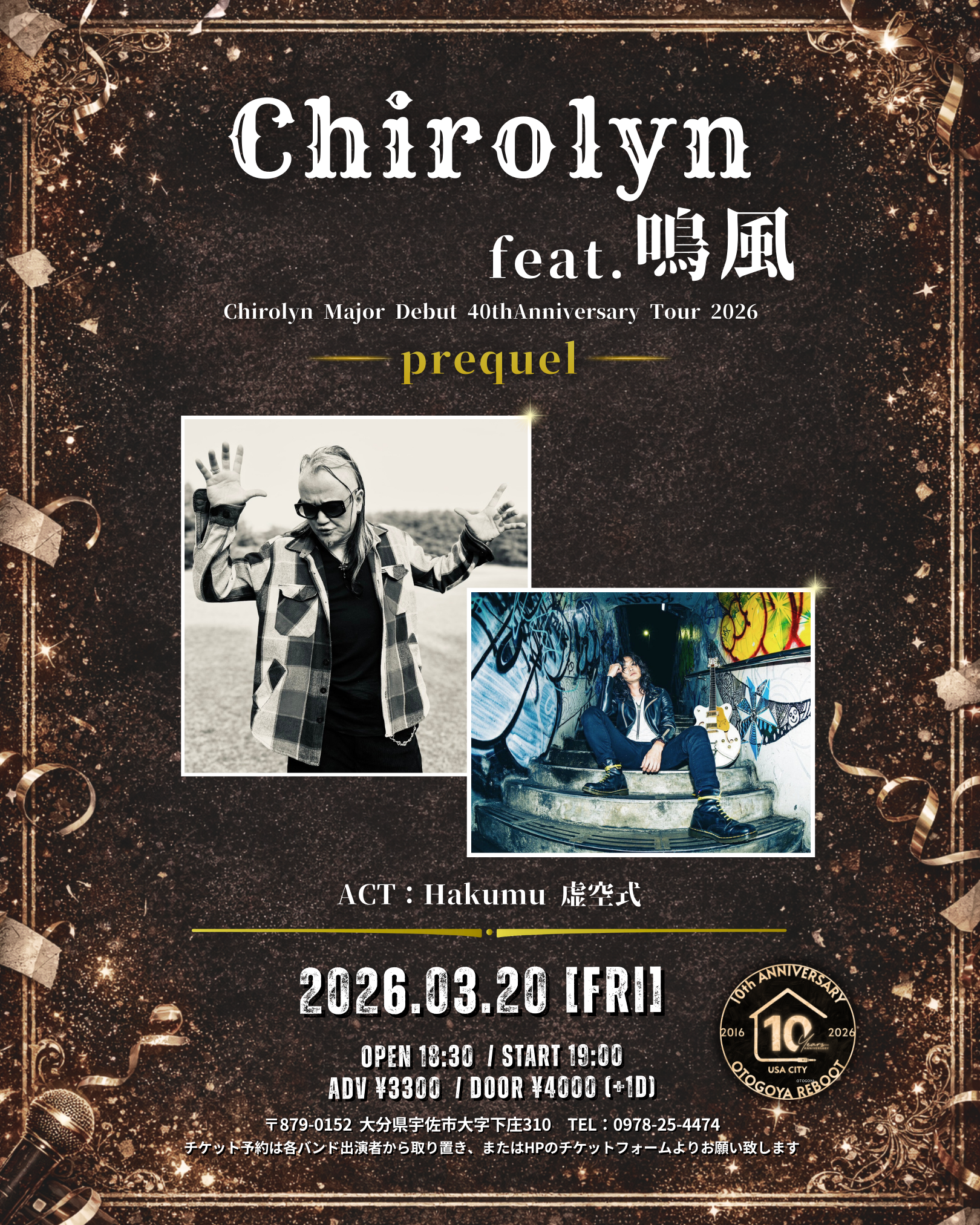 出演者 Chirolyn~feat.鳴風 Hakumu 虚空式 OPEN 18:30 / START 19:00 前売券(税込) 3,300円 当日券(税込) 4,000円 1ドリンク 600円